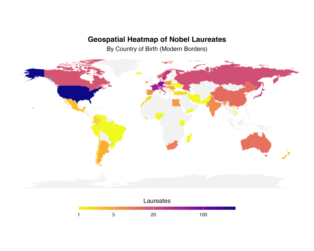 The mapping visuals the density of Nobel laureates based on their birth countries. The darker colors represent higher numbers of laureates. The United States and Western Europe appear darkest, indicating the highest concentrations. Parts of East Asia and Australia show moderate representation while most of Africa and South America appear lighter. The heatmap visually reinforces patterns shown in the bar charts above as well. These patterns align with the broader argument that the Nobel Prize both reflects and reproduces global power structures, elevating achievements from already privileged regions while underrepresenting others. Nobel laureates are overwhelmingly born in wealthy and industrialized countries. The United States and Western Europe dominate to such an extent that they reshape the entire visualization’s color scale. The Global South’s minimal coloration highlights stark geographic inequality in who becomes recognized as a producer of global knowledge.