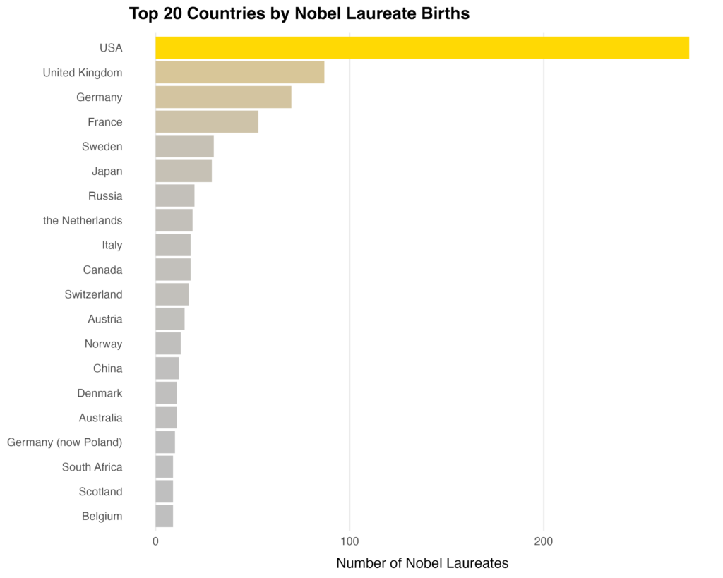 The horizontal bar chart displays the top 20 countries with the highest number of Nobel laureates by country of birth. The United States dominates all other nations, followed by Unites Kingdom, Germany, and France. The USA’s bar stretches to nearly 300 laureates, creating a scale that visually dwarfs all other countries. This single bar forces the x axis to expand dramatically, making even high performing European countries appear small in comparison. This is a crucial visual effect, because the size of the U.S. bar doesn’t just indicate numerical dominance; it reshapes the entire chart and highlights the extent of this imbalance. The bottom part of the list includes countries such as China, Australia, South Africa, Scotland, and Belgium, each with relatively few laureates compared to the dominant Western nations. Their presence shows that Nobel laureates do uneven emerge globally.