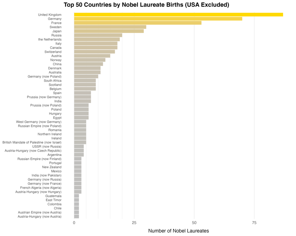 The bar chart removes the United States to better reveal patterns among the remaining countries. With the U.S. excluded, the United Kingdom becomes the leading country, followed by Germany and France. These three nations stand far ahead of all others, with bar lengths that extend dramatically further than the rest, visually signaling their disproportionate representation. Below them, countries like Sweden, Switzerland, Austria, Italy, and the Netherlands appear next, forming a dense cluster of Western European nations with moderate numbers of laureates. This geographic concentration suggests that the Nobel archive strongly reflects European intellectual history, especially that of Northern and Western Europe, because they are regions long associated with institutionalized research universities, laboratories, and state funded science. The chart shows that there are still countries that make small, yet meaningful contributions such as Prussia and Austria Hungary. This visualization emphasized how Nobel recognition is distributed across national boundaries.