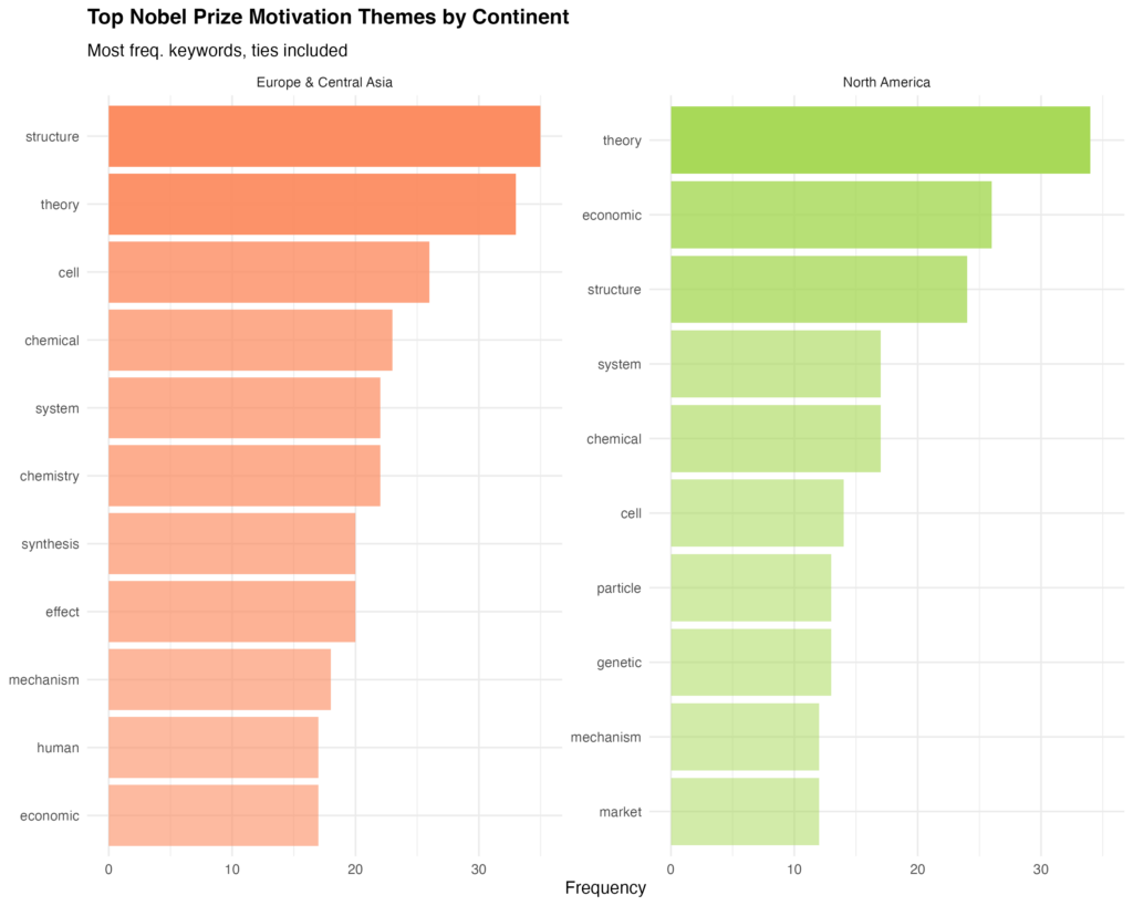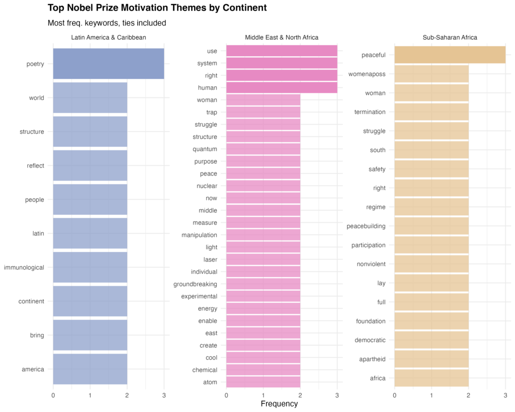 This region shows a much wider spread of terms (hence why there’s more bars), most tied at the same frequency. Top keywords include use, system, right, human, woman, and trap. Here we see overlapping thematic domains: human rights, gender, geopolitical struggle, and science. The presence of scientific words (e.g., quantum, atom, experimental) alongside political and social ones (e.g., peace, human, east) suggests mixed recognition across disciplines, from physics innovations to peace advocacy. This variation implies that laureates from this area receive awards tied to technological advancement as well as social justice, revealing this region as a site of both scientific innovation and political conflict.
