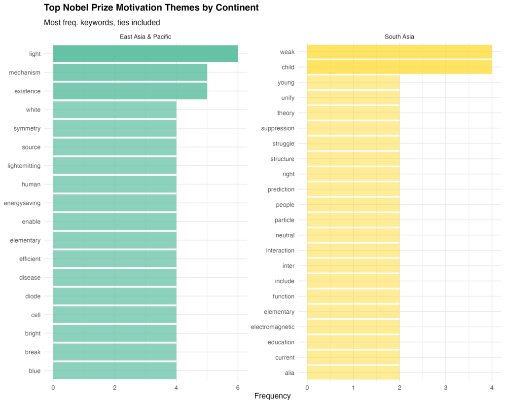 Data Visualization 2: Top Nobel Prize Motivation Themes by Continent (East Asia & Pacific vs. South Asia)